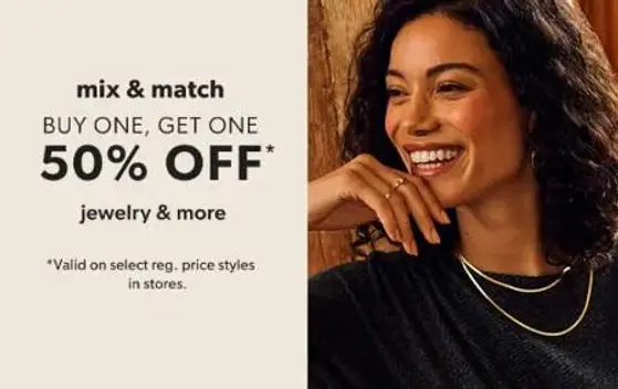 Don't miss out! Shop in store and enjoy buy one, get one 50% off jewelry & more.