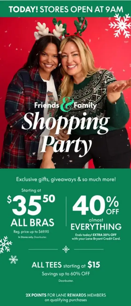 Valid in Lane Bryant stores on 10/20 through 10/26/2025. Offer valid on as marked in-stock clothing, accessories, sleep & swim. Excludes early access, panties, clearance, third-party brands (e.g., Sketchers & Lemon). Not combinable with coupons or other discounts unless otherwise stated.