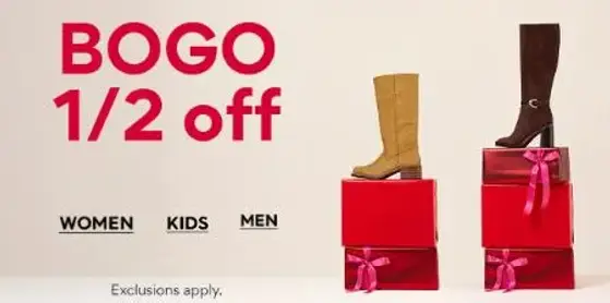 BOGO 1/2 OFF:Buy one item, get a second item of equal or lesser value for half price in stores. Mix and match shoes and bags: Buy one item, get a second item of equal or lesser value for half price. Excludes socks, insoles, shoe care, Bates, Birkenstock, Bogs, Brooks, Caterpillar, Crocs, Diff Eyewear, Dr. Martens, ECCO, Frye and Co., Harley Davidson, Jansport, Jordan, Koolaburra by UGG, Native, New Balance, Nike, OOFOS, SOREL, Vionic, select adidas, select ASICS, select Columbia, select Converse, select Dr. Scholl's, select HEYDUDE, select Hunter, select Naturalizer, select Sof Sole, select Steve Madden, select Teva, select Timberland and select Vans.